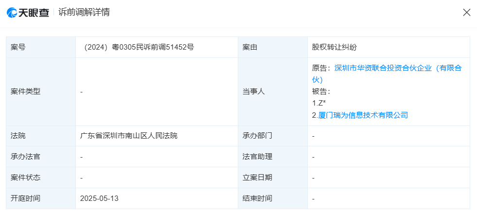 值得一提的是,华资联合的退出过程并非一帆风顺,期间曾与瑞为技术对簿公堂。天眼查数据显示,2025年5月,华资联合以股权转让纠纷为由向南山区人民法院提起诉讼,案件随后进入诉前调解环节。3个月后,华资联合将所持公司0.417%的股权转让给桐乡普华,双方纠纷告一段落。
