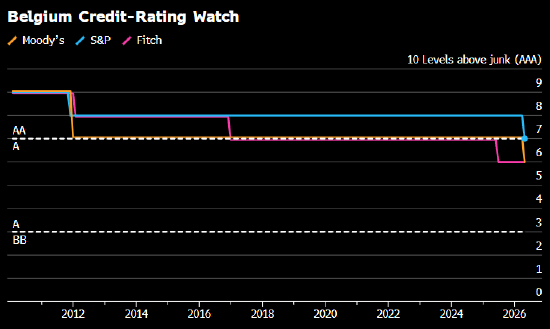 就在一周前,穆迪也下调了该国评级。标普此次下调意味着在三大评级机构中,仅剩一家仍将比利时评级维持在AA高等级区间。