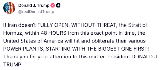 美国总统特朗普在Truth Social发文称:“如果伊朗未能从此时此刻起48小时内,在无任何威胁的情况下完全开放霍尔木兹海峡,美利坚合众国将摧毁并彻底瘫痪其各类发电厂,从最大的发电厂开始动手!”